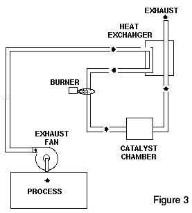 | Catalytic Oxidation Catalytic oxidizers are an alternative to thermal oxidizers for oxidizing gaseous, combustible contaminants into carbon dioxide and water. Their successful operation is limited to a more restricted range of applications than thermal oxidizers; but where applicable, catalytic units offer the potential of significantly lower fuel consumption and operating costs plus reduced CO and NOx emissions. The basic elements of the catalytic unit are a preheat/mixing section, designed to achieve a uniformly preheated and distributed waste stream flow, and the catalyst bed or catalyst matrix, where the majority of the oxidation reactions take place. The oxidation of most hydrocarbons and carbon monoxide occur rapidly in the range of 300 to 900° F (150 - 480° C) over catalysts. With thermal oxidizers, the oxidation reaction requires a high temperature of 1200 to 1600° F (650 - 815° C) to break the carbon, hydrogen and oxygen bonds. Besides reduced energy consumption, NOx emissions from catalytic units are very low because of the lower oxidation temperatures being used, as well as the lower burner firing rates. In addition, the oxidizing nature of the catalyst results in very low CO emissions. However, there are trade-offs involved to gain these advantages. Catalytic oxidizers can be subject to masking agents or poisons that inhibit the effectiveness of the catalyst. Catalytic systems are limited to applications in which the waste stream has negligible particulate loading and/or "poisons" which can reduce the effectiveness of the catalyst. These poisons are primarily silicon and phosphorus which coat the catalyst; halogens such as chlorine which directly attack the active metals converting them to an inactive form; and sulfur which inhibits the activity of some catalysts. The oxidation activity of the catalyst can also be reduced by the loss of active components through attrition, deposition of unreacted VOC (coking) onto the catalyst surfaces, or sintering of the catalyst (collapse of the catalyst structure caused by high temperatures). (See Figure 3) |
