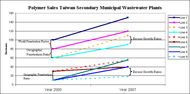 The report also provides the relationships between the forecast and the causative factors. In Figure 2 Polymer Sales Taiwan Secondary Municipal Wastewater Treatment Plants, the top line is “polymer sales based on sewage transport mgd. Since much of the present wastewater does not pass through secondary treatment plants, the quantity of polymer which would be needed if all sewage received secondary treatment is much larger than the amount which is based on actual and predicted secondary treatment capacity. This difference is the world penetration factor. McIlvaine is continually revising forecasts of sewage transport mgd, primary treatment mgd, and secondary treatment mgd for each country of the world.