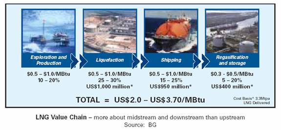 Each of these links has its own set of technology challenges and investment criteria, but each is linked to the others in the sense that no one component is a viable business investment without the other. The diagram below describes simplistically the links of the “LNG Value Chain” and typical value of each link.