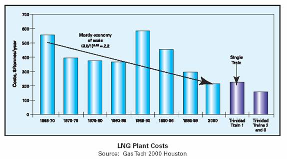 The outstanding safety, reliability, and high operating factors of the LNG industry build up confidence in larger trains. Design efficiencies and technology improvements have all contributed to improved project economics. BP’s Trinidad LNG Train 1, completed in June 1999, set a new benchmark for LNG unit plant capital cost at less than $200/tonne of annual plant capacity, as detailed above in LNG Plant Costs.