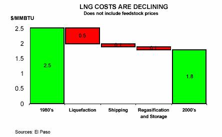 Competition among builders also is driving down costs for new regasification plants. Regasification costs have fallen about 18 percent. The result of all these improvements is that the overall cost of LNG delivery has been reduced by almost 30 percent during the last 20 years.